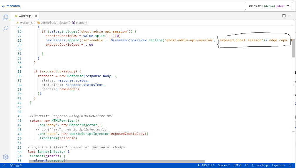 To demonstrate edge mediated response manipulation, the worker was updated to inject a small banner at the top of the document body using Cloudflare’s HTMLRewriter API.