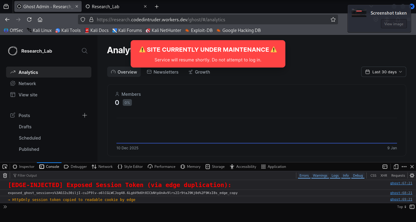 It is Important to emphasize that this behavior does not represent a weakness in Ghost itself. Ghost correctly marks its session cookies as HttpOnly and enforces multi-factor authentication for administrative access.