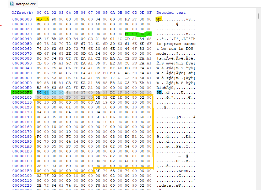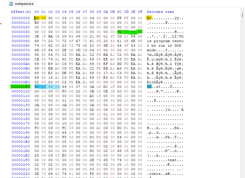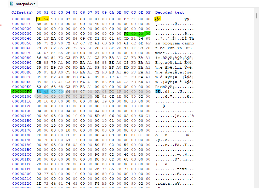 Because it’s little-endian the bytes appear in reverse order, but represents a single 32-bit number. so the value F0 00 00 00, means e_lfanew is 0x000000F0, Jumping to address 0xF0 in HxD, I landed on the PE Signature: